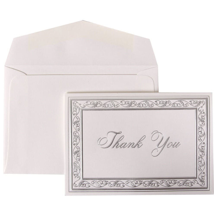 JAM Paper Thank You Card Set, 4 7/8in x 3 3/8in, 65 Lb, Bright White/Silver Border, Set Of 104 Cards And 100 Envelopes