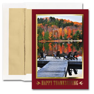 Thanksgiving is a time of peace, quiet, and of course food. Give the joyous message of thanks with JAM Paper® Quiet Thanksgiving Cards. These elegant, smooth-finish cards greet your friend or loved one with the image of a calming lake in autumn. The vibrant gold lining and lettering will leave a sparkle in their eye, right before they read your loving message. All cards are blank on the inside so you can customize you message and show how much you care. Each 25 pack of 5.625 x 7.875 inch Thanksgiving Day cards comes with a set of 25 envelopes to make the giving season that much easier.