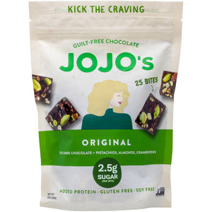 Enjoy a tasty midday pick me up with JOJOs Chocolate Original Dark Chocolate Bites. These bites combine dark chocolate, almonds, pistachios and dried cranberries for a healthy, delicious experience.