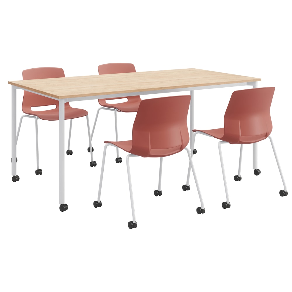 KFI Studios Dailey Table And 4 Chairs, With Casters, Natural/White Table, Coral/White Chairs
