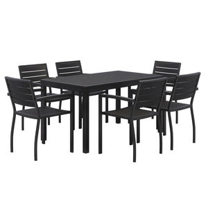 Create a stylish patio space for you and your guests with the KFI Studios Eveleen 7-Piece Outdoor Patio Set. Powder-coated aluminum frames offer ample stability.