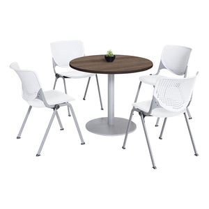 KFI Studios KOOL Round Pedestal Table With 4 Stacking Chairs, Studio Teak/White