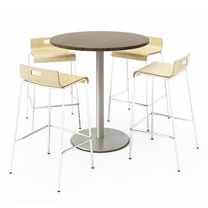 KFI Studios Round Bistro Pedestal Table With 4 Stacking Bar Stools, Studio Teak/White