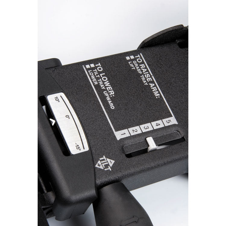 Leverless arm with height adjustable indicator gauge. Easy to view tilt dial with soft touch adjustment knob. 10 degree positive/15 degrees negative tilt. Soft to touch Viscoflex™ memory foam wrist support and pad with Aegis™ antimicrobial product protection. Lift n Lock feature with eight inch vertical height range. Low profile design for optimal leg clearance.