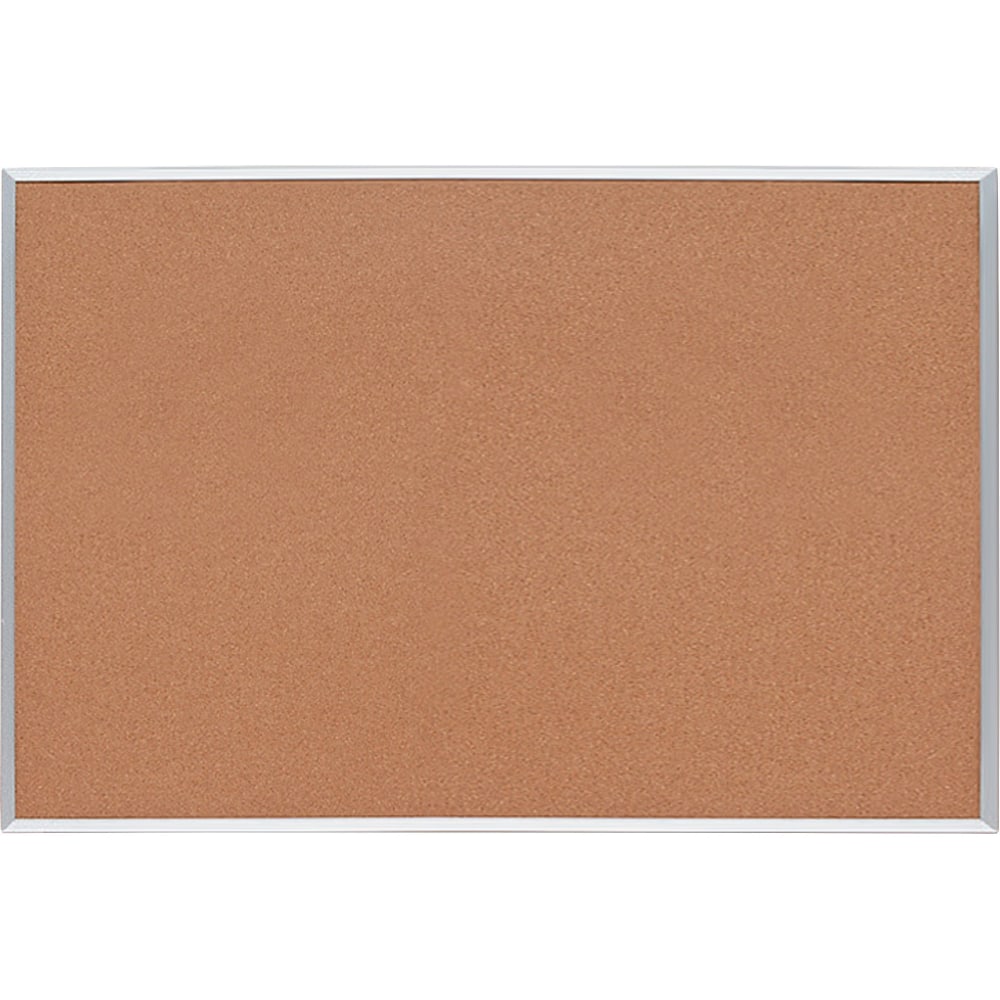 This corkboard has an aluminum frame and includes mounting hardware. It features thick cork that is laminated to sturdy fiberboard with a sealed back.
