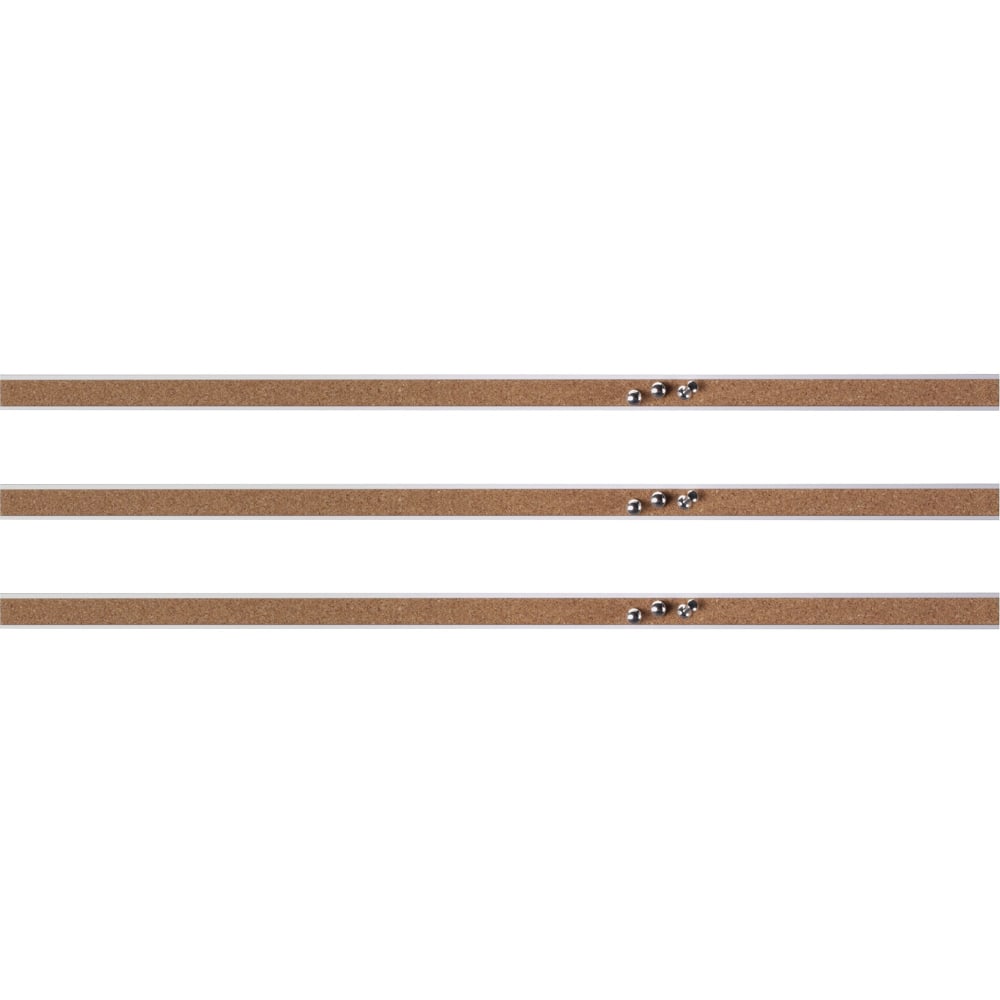 Display relevant information with this 3-pack of Lorell cork strip bulletin bars. Fade-resistant construction delivers durability, while the self-healing cork surface enhances the look of your wall space. The strip-style design takes up little space, and the anodized aluminum frame supports easy mounting above chalkboards or whiteboards. This Lorell cork strip bulletin bars comes with three pushpins for keeping notes and reminders in place.