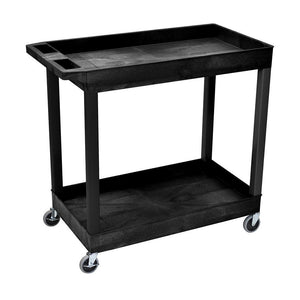 - High-density, molded plastic shelves and legs won't stain, scratch, dent or rust. This Luxor E-Series 2-tub plastic black utility cart is built to last.