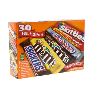 - Includes 30 full-size Snickers, Peanut M&M's, M&M's, 3 Musketeers, Starbursts and Skittles.