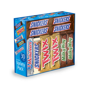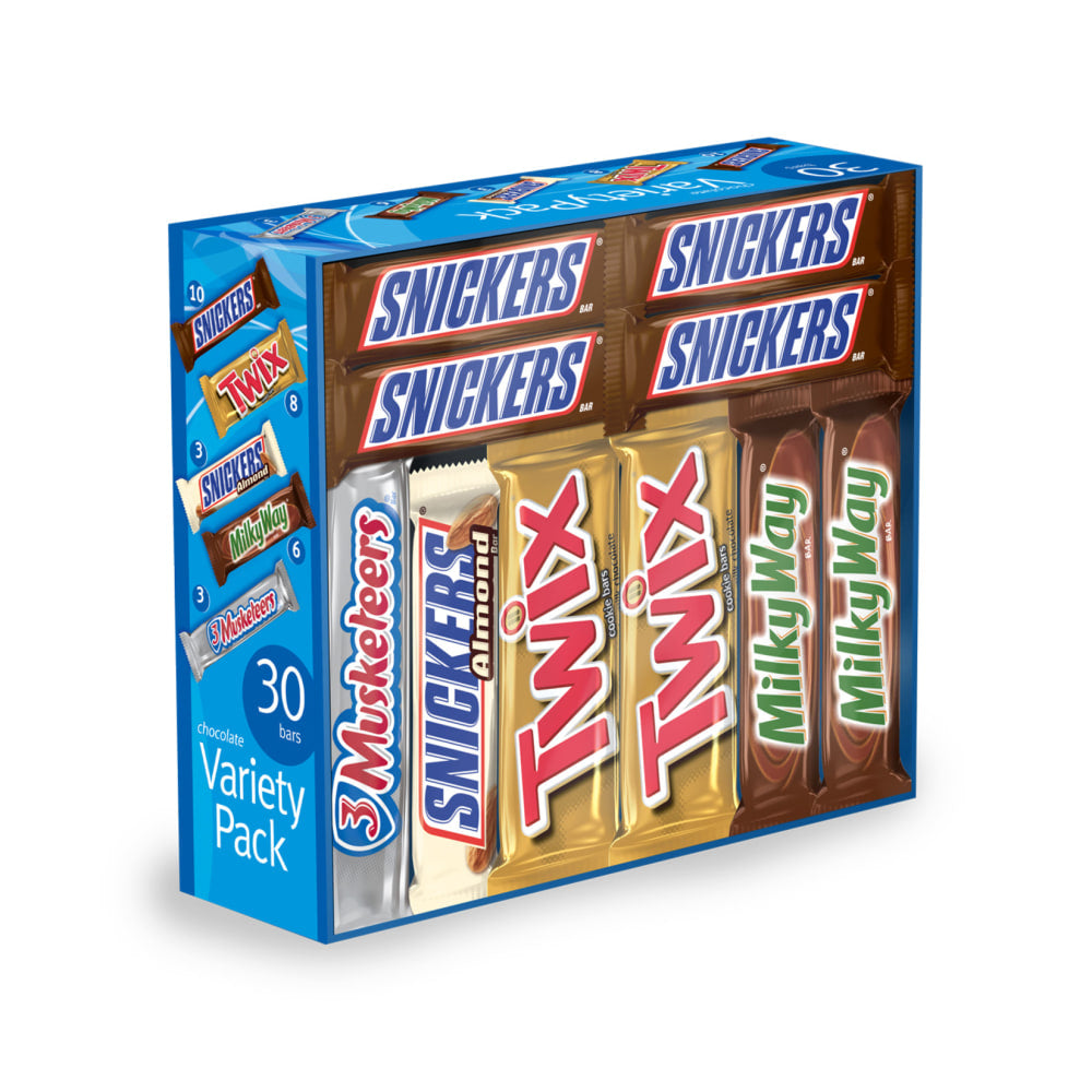 - Variety pack includes Snickers, Snickers Almonds, Twix, 3 Musketeers and Milky Way candy bars.