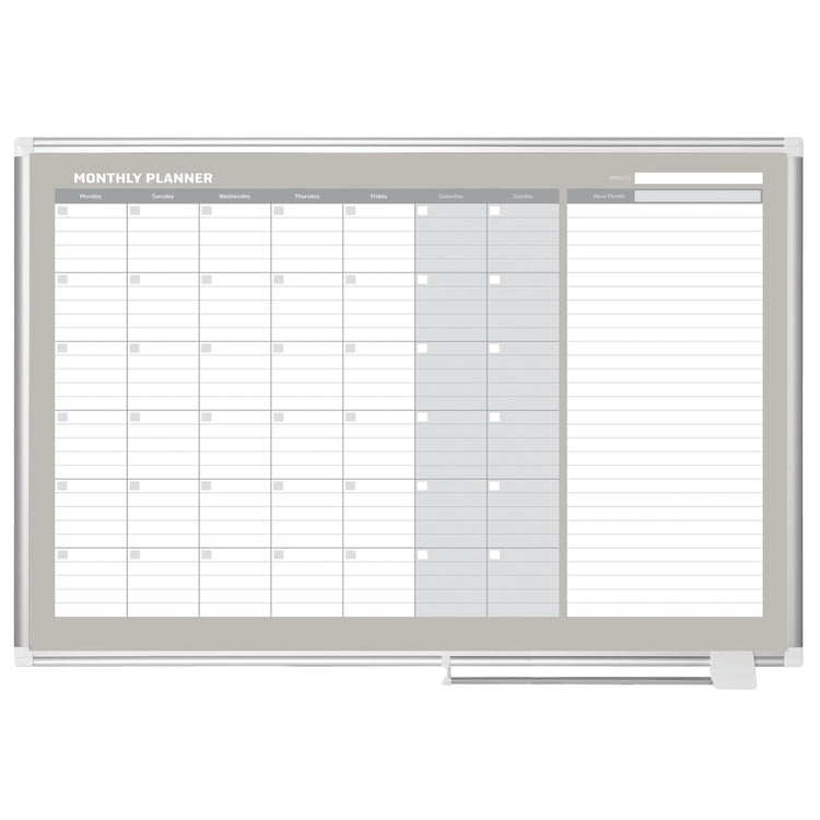Stay on top of goals and plans with this MasterVision Gold Ultra dry-erase monthly planning board. An ample size mounts easily on conference room or kitchen walls, while the sliding aluminum pen tray keeps your markers close at hand. Divided into daily squares with room for notes on the side, this MasterVision Gold Ultra dry-erase monthly planning board makes it easy to plan ahead.