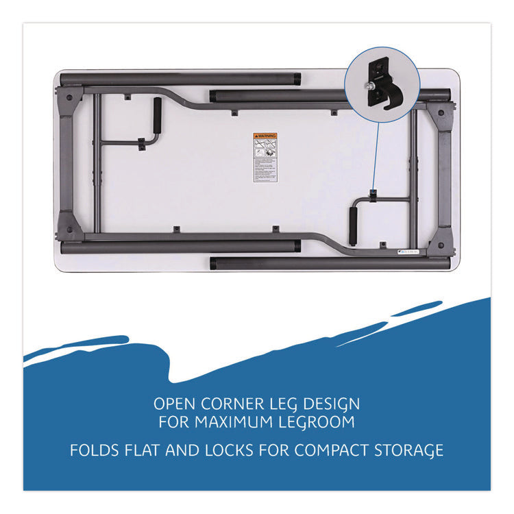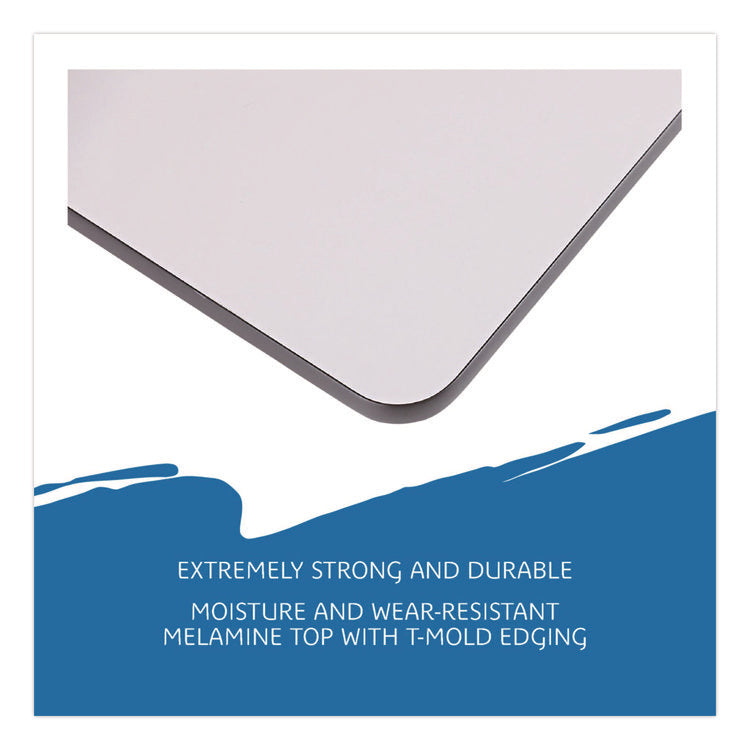 Features an open-corner leg design for maximum legroom, comfort, and seating capacity. Ideal for all commercial applications. The single-cam, quick-release lever makes setup and takedown easy and efficient. Heavy-duty 1-1/2" powder-coated legs fold into underside for compact storage. Melamine T-Mold top resists wear and moisture, while bumpers help protect the table when in use or stored. Non-mar feet protects flooring.