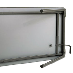 Features an open-corner leg design for maximum legroom, comfort, and seating capacity. Ideal for all commercial applications. The single-cam, quick-release lever makes setup and takedown easy and efficient. Heavy-duty 1-1/2" powder-coated legs fold into underside for compact storage. Melamine T-Mold top resists wear and moisture, while bumpers help protect the table when in use or stored. Non-mar feet protects flooring.