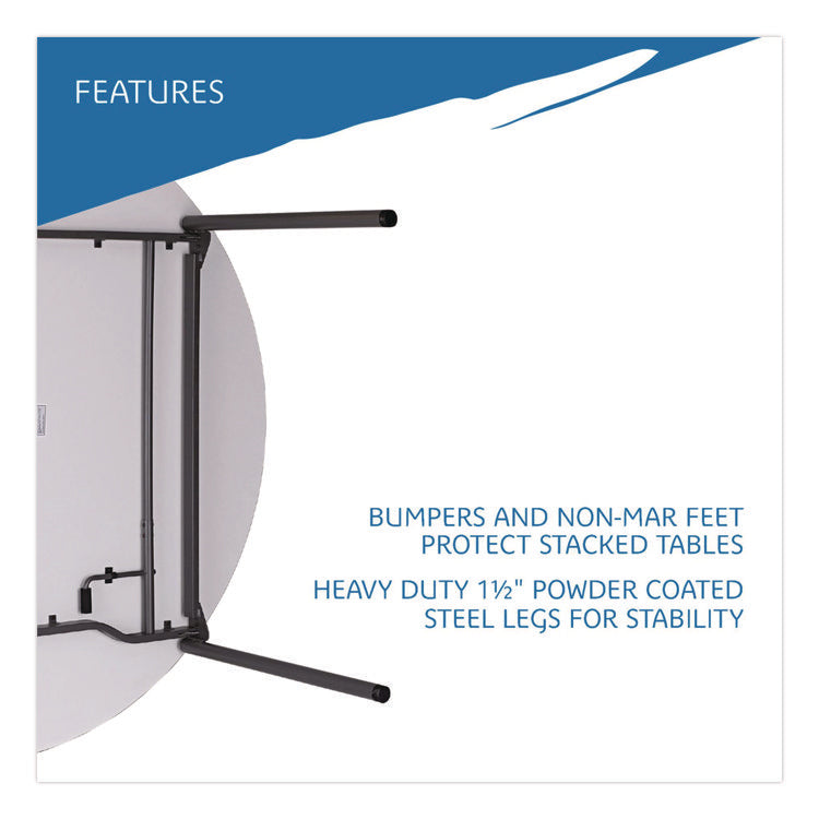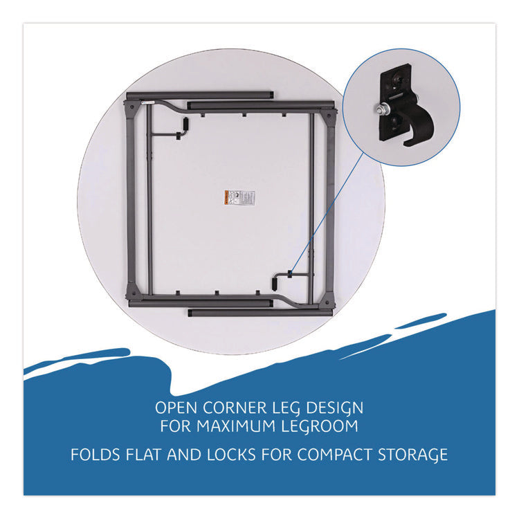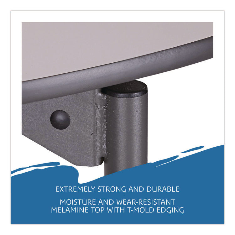 Features an open-corner leg design for maximum legroom, comfort, and seating capacity. Ideal for all commercial applications. The single-cam, quick-release lever makes setup and takedown easy and efficient. Heavy-duty 1-1/2" powder-coated legs fold into underside for compact storage. Melamine T-Mold top resists wear and moisture, while bumpers help protect the table when in use or stored. Non-mar feet protects flooring.