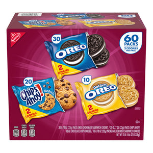 - Box contains 30 Oreo packs, 20 Chips Ahoy packs and 10 Golden Oreo packs with 2 cookies in each.