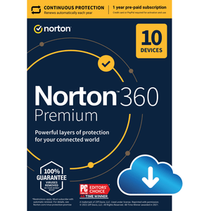 Norton 360 Premium, For 10 Devices, 1 Year Subscription, Windows, Download
