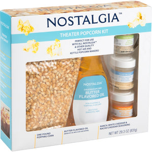 - Includes 16 oz of soft shell popcorn kernels, 8 oz of butter-flavored oil, 1 oz of nacho cheddar seasoning, 1 oz of white cheddar seasoning and 1 oz of ranch seasoning.