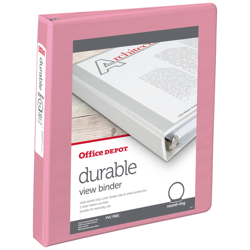 Office Depot Brand 3-Ring Durable View Binder, 1in Round Rings, Pink