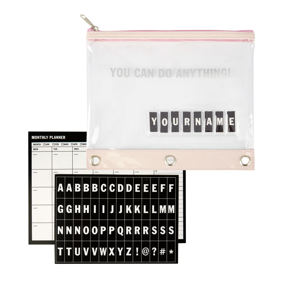 - Includes letters for you to put your name at the front of the pouch, and a monthly planner sheet.