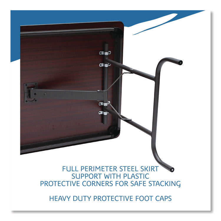 Wear-resistant, 3/4" thick melamine top with vinyl T-mold edge. Melamine sealed underside helps prevent moisture absorption. Full perimeter steel skirt support with plastic corners to protect surface when stacking. 1" diameter, heavy gauge steel legs with heavy-duty foot caps to protect floors. Heavy-duty leg supports and gravity leg lock for secure set-up. Folds to 2-1/2" for compact storage.