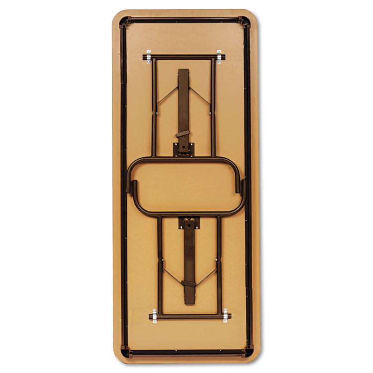 Wear-resistant, 3/4" thick melamine top with vinyl T-mold edge. Melamine sealed underside helps prevent moisture absorption. Full perimeter steel skirt support with plastic corners to protect surface when stacking. 1" diameter, heavy gauge steel legs with heavy-duty foot caps to protect floors. Heavy-duty leg supports and gravity leg lock for secure set-up. Folds to 2-1/2" for compact storage.