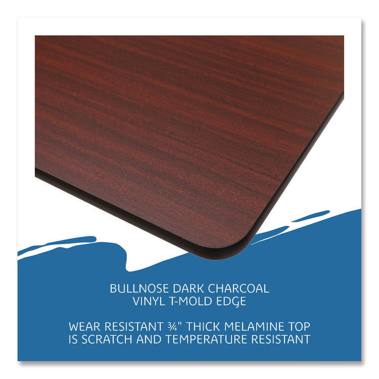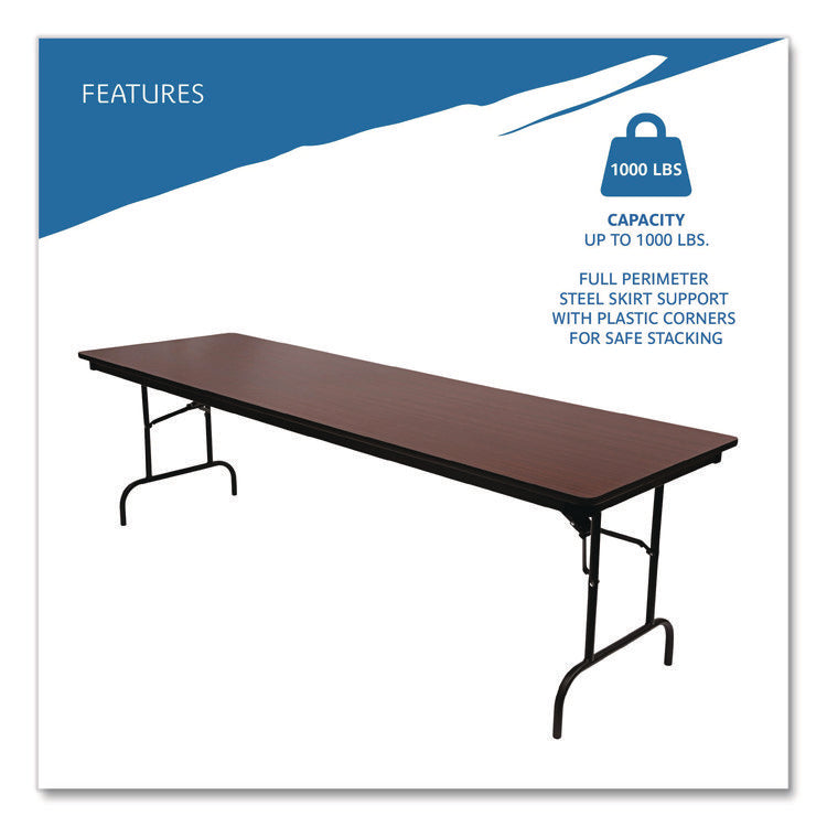 Wear-resistant, 3/4" thick melamine top with vinyl T-mold edge. Melamine sealed underside helps prevent moisture absorption. Full perimeter steel skirt support with plastic corners to protect surface when stacking. 1" diameter, heavy gauge steel legs with heavy-duty foot caps to protect floors. Heavy-duty leg supports and gravity leg lock for secure set-up. Folds to 2-1/2" for compact storage.