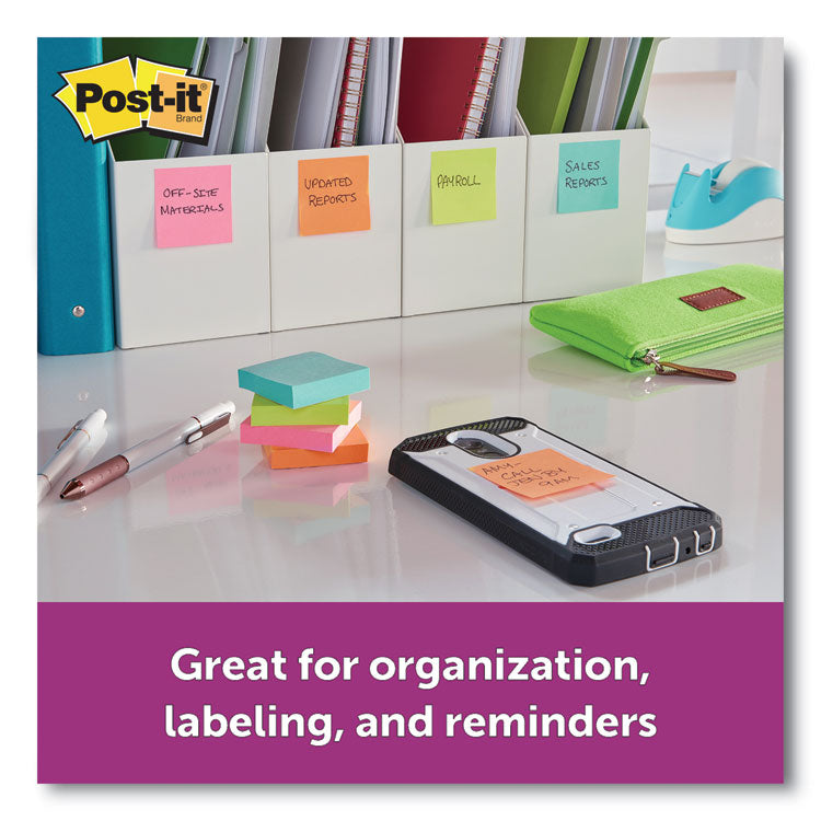 Post-it® Super Sticky Notes have 2X the sticking power to help you organize and keep on top of any project. Colors are from our Supernova Neons collection. Ideas are out of this world with the electric colors of the Supernova Neon collection. Sort your project by color and subject, and accomplish more. Post-it® Super Sticky Notes are recyclable and stick again and again and allow to move your notes with you throughout your day.