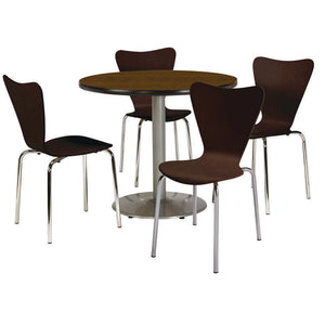 Attractive and contemporary breakroom/cafeteria furniture. Table and 4 chair set. The table is 1.25" thick with a high-pressure laminate surface and T-mold edge. The base is made of durable cast iron. The column is 16-gauge steel with a 3" diameter. Leveling glides for stability on uneven floors. The chair is made of attractive bent plywood and has a durable high pressure laminate surface. 0.75" inch round chromed 16-gauge steel tube frame. Non-marring polyurethane glides. Chairs stack 5 high. Overall chair dimensions: 20.5" W x 21" D x 34" H. Tables shipped unassembled. Chairs shipped assembled.