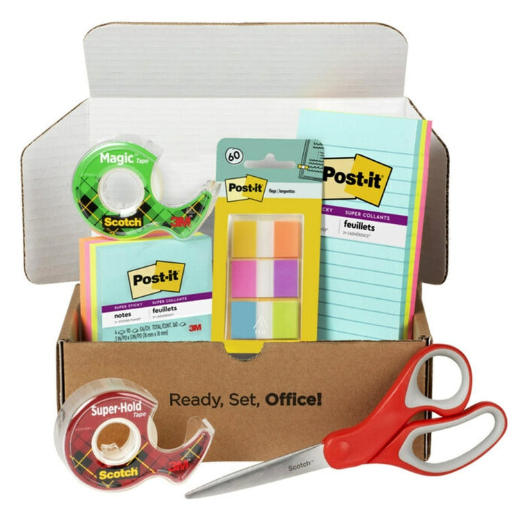 Post-it and Scotch Brand Essentials Pack, 7 Pads of Assorted Super Sticky Notes, 1 Pack Flags, 1 Roll Magic Tape, 1 Roll Super-Hold Tape, 1 Multi-Purpose Scissors