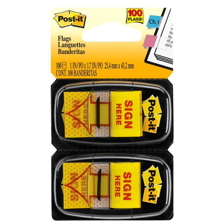 Post-it Notes Sign Here Printed Flags, 1in x 1-7/10in, Yellow, 50 Flags Per Pad, Pack Of 2 Pads