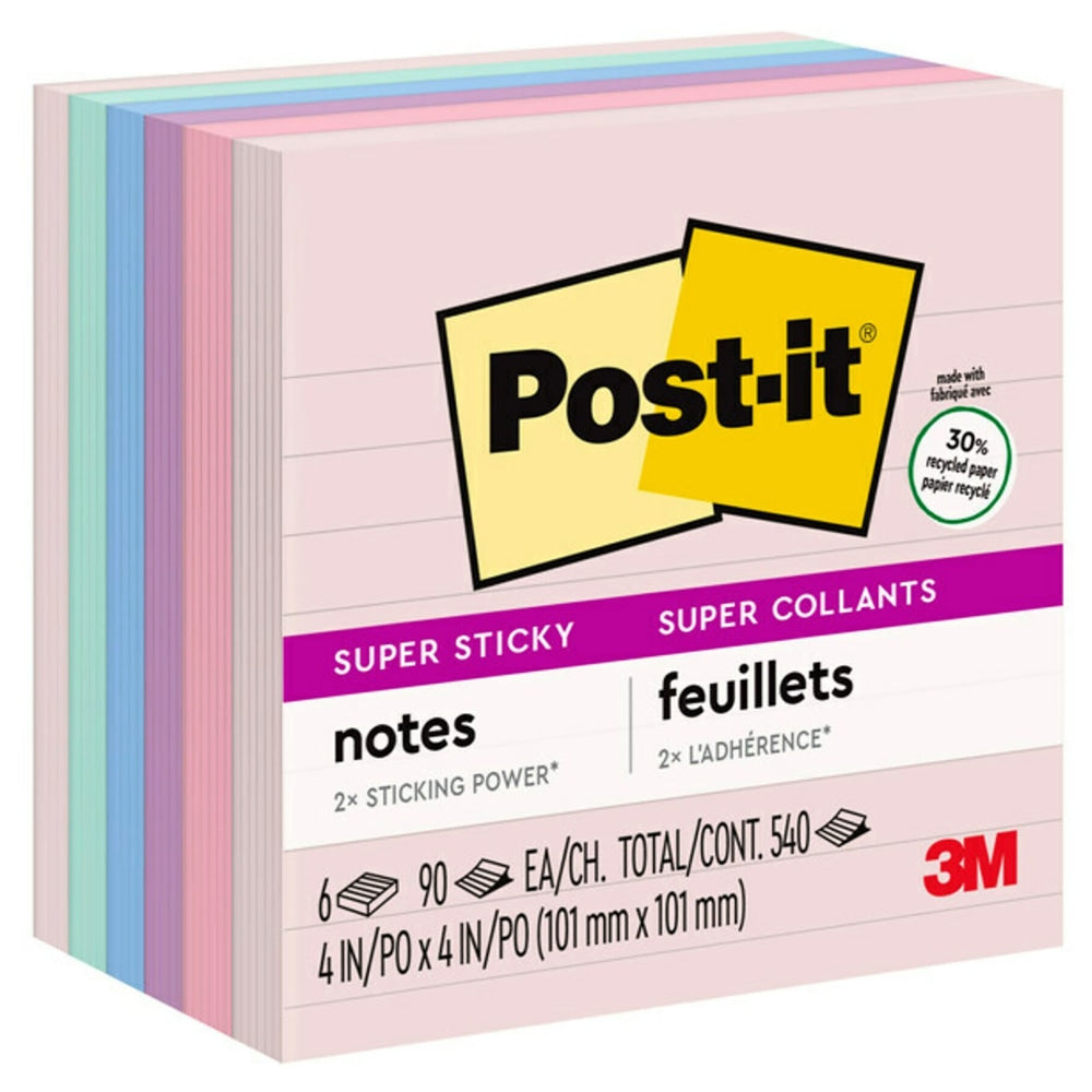 Post-it Recycled Super Sticky Notes, 4 in x 4 in, 6 Pads, 90 Sheets/Pad, 2x the Sticking Power, Wanderlust Pastels Collection, Lined, 30% Recycled