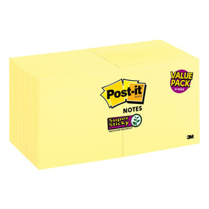 Cut through the clutter with the iconic Canary Yellow Post-it Super Sticky Notes. Whether jotting down your daily to-do's, brainstorming big ideas, studying or setting reminders, colors and ideas are always brighter together. These sticky notes feature 2X the sticking power. They also stick and re-stick - allowing you to move your notes with you throughout your day. They’re ideal for walls, doors, windows and other vertical surfaces, and like all Post-it Notes, they stick securely yet remove cleanly without damage. Keep your ideas across your notebooks, classroom books, calendars or other documents. No tape or tacks are needed with adhesive notes, saving you money and time on office products or school supplies. A great memo pad, these are ideal for using for notes or reminders to yourself or others. Post-it Super Sticky Notes are the perfect solution for shopping lists, reminders, notes on computer screens, time tracking, to-do lists, marking cables, color-coding documents, reminding kids to do chores, storyboarding, scratch paper and agile processing. These sticky notes are the iconic Canary Yellow. All Post-it Notes are sourced from certified, renewable and responsibly managed forests, and all Post-it Notes are recyclable, so you can recycle them when they are no longer needed.