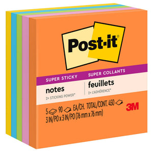 Post-it Super Sticky Notes, 3 in x 3 in, 5 Pads, 90 Sheets/Pad, 2x the Sticking Power, Energy Boost Collection