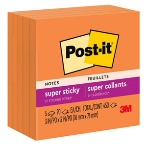 Post-it Super Sticky Notes, 3 in x 3 in, 5 Pads, 90 Sheets/Pad, 2x the Sticking Power, Neon Orange