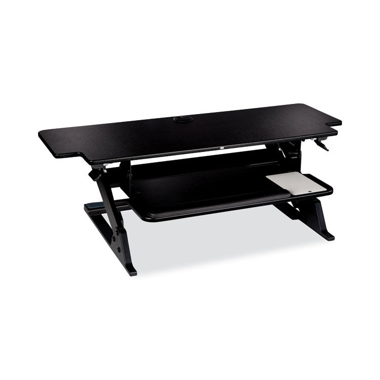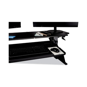 Gas assisted continuous height adjustment allows you to move smoothly and quietly between sitting and standing positions in seconds. Height adjustment range from 6.2'' to 20'' above the desk accommodates a wide range of users. 10°/-10° keyboard surface tilt to help achieve comfortable typing position. Primary work surface is large enough to fit two 24'' monitors and holds up to 35 lb. Includes 3M Gel Wrist Rest for your keyboard and 3M Precise Mouse Pad. Pre-assembled solution eliminates need for installers.