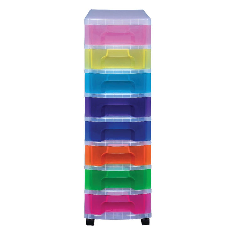 Really Useful Box Plastic 8-Drawer Storage Tower, 7 Liters, 36 1/2in x 15 3/4in x 12in, Clear/Rainbow