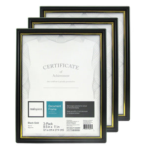 - Photo and document frames (8-1/2" x 11") feature black and gold colors and come in a pack of 3.