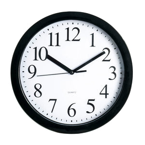 - Round quartz analog wall clock measures 9" and has a black finish.