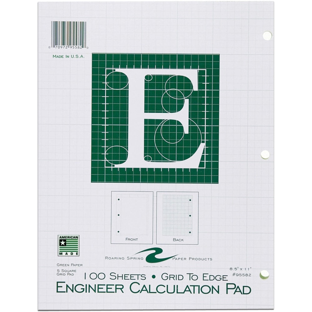 Roaring Spring 5x5 Grid Engineering Pad, 15# Green, 3 Hole Punched, 8.5in x 11in 100 Sheets, Green Paper Gride to Edge