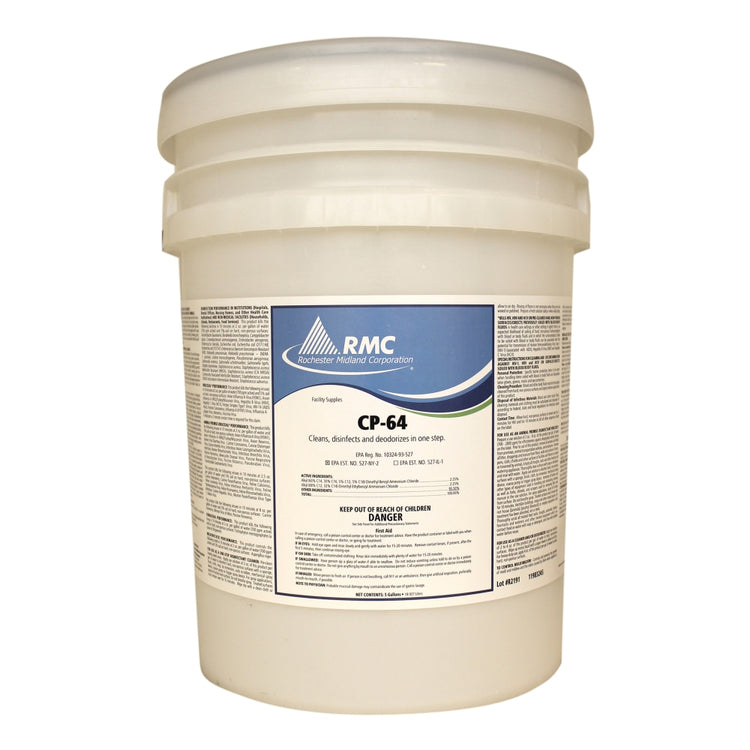 Thoroughly clean, disinfect and deodorize tough surfaces with Rochester Midland CP-64 Disinfectant. This hospital-grade cleaner will kill bacteria and viruses, leaving behind a fresh scent.