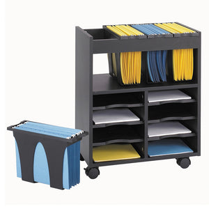 Boost productivity and keep your office running efficiently with the Safco Go Cart. Equipped with pullout shelving and hanging-file tubs, this rolling cart helps make accessing and transporting files between offices a breeze.