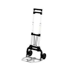 Lightweight, portable hand truck features a fold-down aluminum frame that is ideal for sales staff, travelers and small offices. The cart's collapsible design lets it fit into small spaces for compact storage.