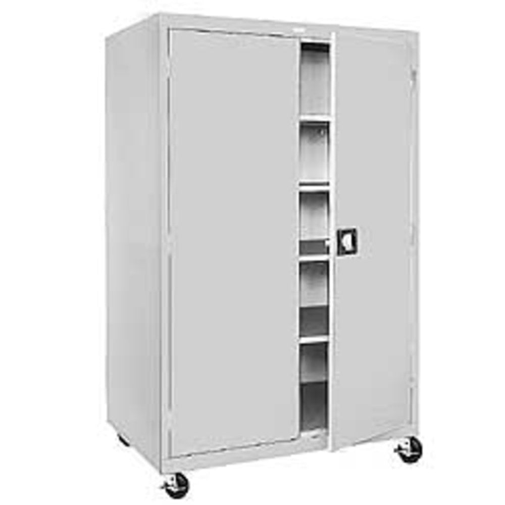 This Sandusky jumbo mobile storage cabinet is ideal for lasting storage in your home or office. The shelves can hold up to 230-lb each and the handle locks for added security.