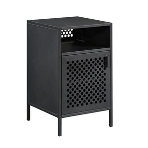 This unique Boulevard Cafe side table from Sauder adds just the right amount of style and storage to any room in your home. The artfully perforated door opens to reveal 2-tier storage that's great for books, magazines, DVDs and other peripherals. The roomy tabletop can accommodate a lamp and various knickknacks to brighten up your cozy sitting space.