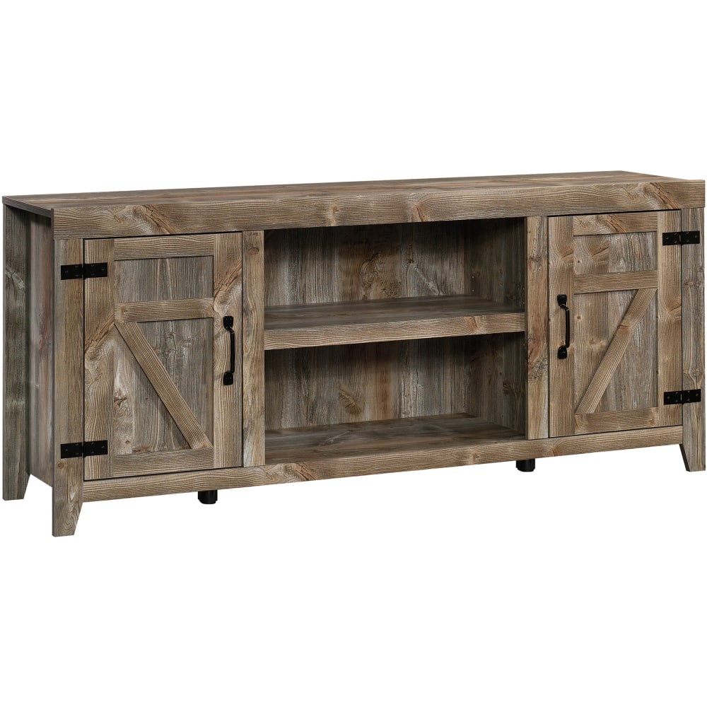 Bring rustic charm to your living room with the Sauder Select Entertainment Credenza. Designed to support up to a 70" TV, this entertainment center has 3 adjustable shelves to accommodate your electronics and cord access in the back for simple setup. Thanks to the open and closed storage areas, you can put decorative items on display at the center and keep other items hidden out of sight behind the side doors.