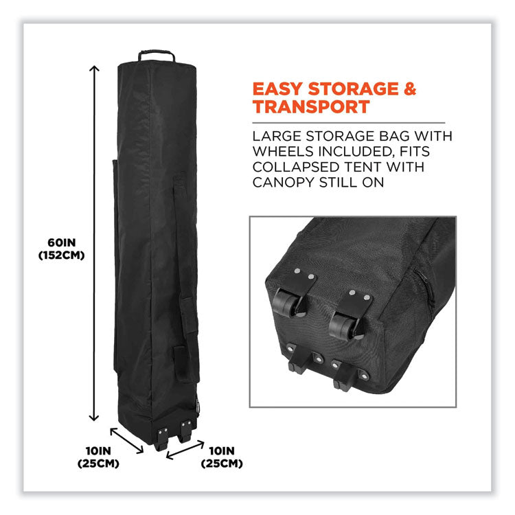 - Large storage bag with wheels included, fits collapsed tent with canopy still on.