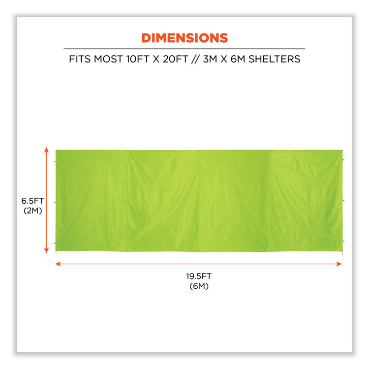 The SHAX 6097 Pop-Up Tent Sidewall lets you add privacy and protection from the sun, wind and rain. This detachable canopy side panel is sold individually and compliments the 20 ft side of the SHAX 6015 Pop-Up Tent. This fire-retardant panel is made with heavy-duty 300-denier polyester fabric with waterproofing polyurethane coating (PU) and UV treatment for added protection. The easy-to-use hook-and-loop straps securely attach the tent wall to the frame. The wind-resistant fabric packs up easily and is reinforced on the corners for added durability. The hi-vis lime color and silver coating provide increased visibility on busy jobsites or at events.