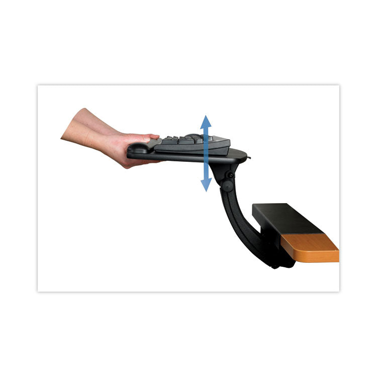 Increase comfort and productivity by placing your keyboard and mouse at a proper level. This keyboard has a sit/stand easy adjust arm which provides height adjustment to 10" above mounting surface and 4" below mounting surface allowing you to alternate between sitting and standing positions. Tilt is adjusted by dialing tilt knob to desired angle. Sturdy platform has proprietary lateral adjustments for getting the keyboard exactly where you want it and an all-in-one platform with wooden construction to minimize bouncing. Articulating mousing platform adjusts in all directions, tilts forward and back, and can be mounted on the right or left side of the keyboard platform. Includes leatherette gel wrist rest with antimicrobial product protection for keyboard and mouse and a Precise™ Mouse Pad that can be placed to the left or right of the keyboard.