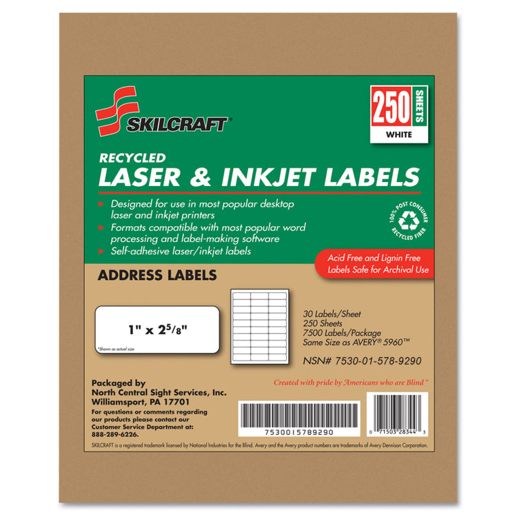 SKILCRAFT 100% Recycled Inkjet/Laser Address Labels, Rectangle, 1in x 2 5/8in, White, Box Of 250 Sheets (AbilityOne 7530-01-578-9290)