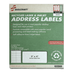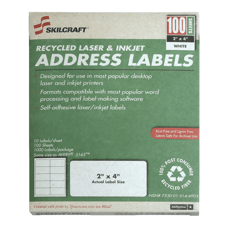 SKILCRAFT Permanent Inkjet/Laser Address Labels, NSN5144903, Rectangle, 2in x 4in, White, Box Of 100 Sheets (AbilityOne 7530-01-514-4903)