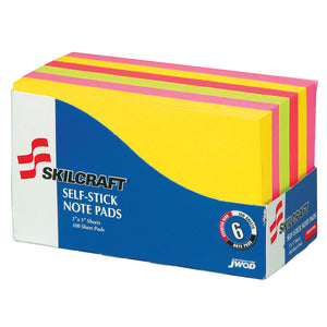 SKILCRAFT Self-Stick Note Pads, 600 Total Notes, Pack Of 6 Pads, 3in x 5in, Assorted Neon Colors, 100 Notes Per Pad (AbilityOne 7530-01-418-1420)